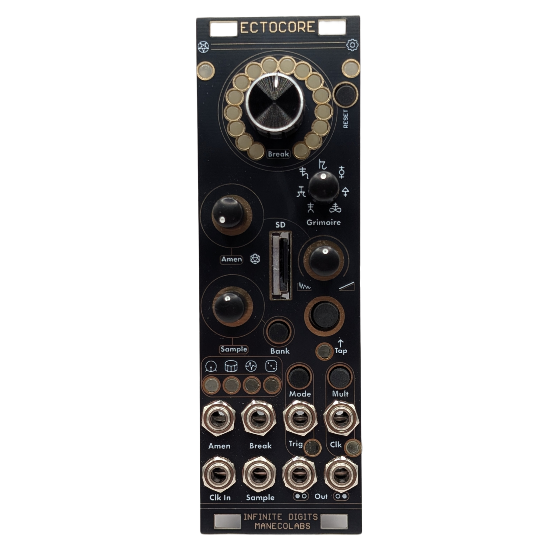 The Ectocore is an algorithmic breakbeat-focused sample mangler music synthesizer. It streams audio straight from an SD card and can chop, slice and effect samples in real time. There are 16 different FX that are available and FX presets are curated through the Grimoire knob. There’s also an internal rungler/turing machine inspired looping random sequencer for quickly generating new slice patterns. It features clock input and output (with a clock divider/multiplier) and will pitch up or down samples to keep them in time. Sample management is easy through 16 banks and a powerful GUI browser tool (https://ectocore.rocks) for chopping and analyzing samples and changing settings.