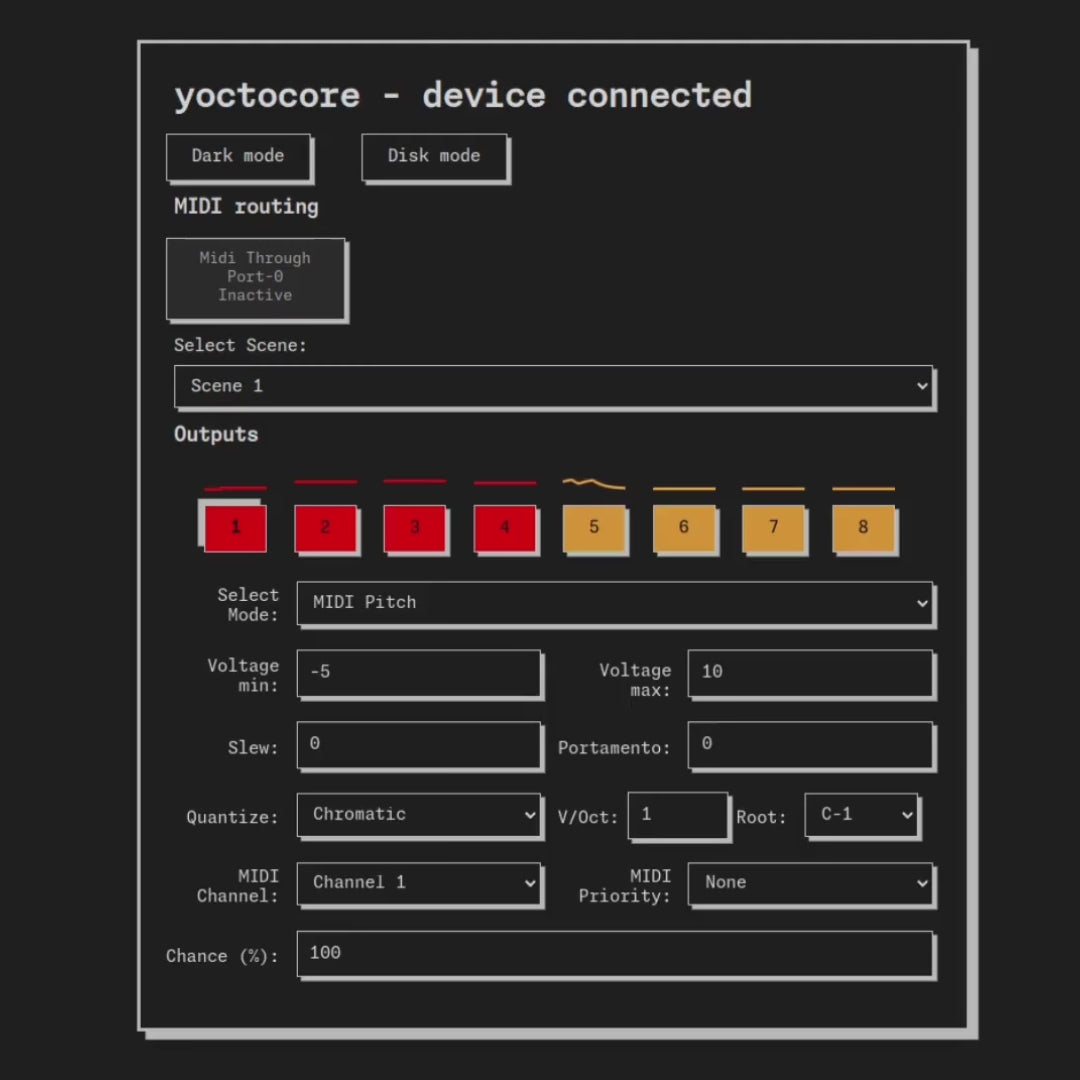 Every output of the yoctocore is fully programmable as a MIDI pitch output, envelope, gate, MIDI key pressure, MIDI control change, MIDI program change, channel pressure, MIDI pitch bend, clock, LFO, or DIY code. There are eight programmable scenes for the eight outputs. More information: https://my.yocotocore.com.